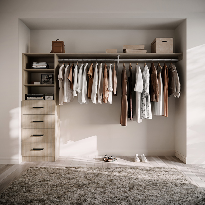 The Galleria Wardrobe 5.0 is a versatile DIY wardrobe solution. Featuring four drawers, adjustable shelves, and ample long hanging space, it's perfect for your longer items and ideal for wider and larger wardrobe openings.