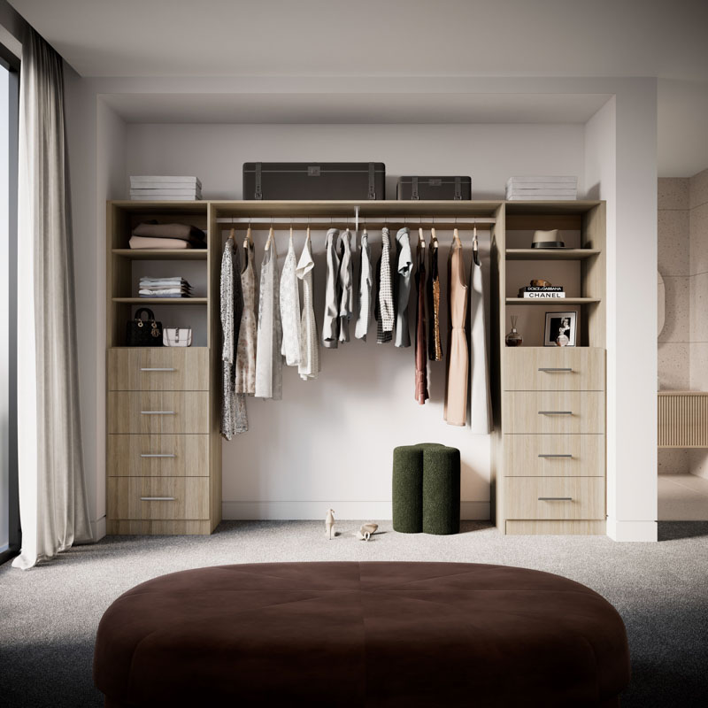 Featuring eight drawers, adjustable shelves, and versatile hanging space, it suits all your wardrobe needs and fits well in wider and larger wardrobe openings. Perfect for accommodating the belongings of two individuals, this wardrobe is your go-to storage solution.